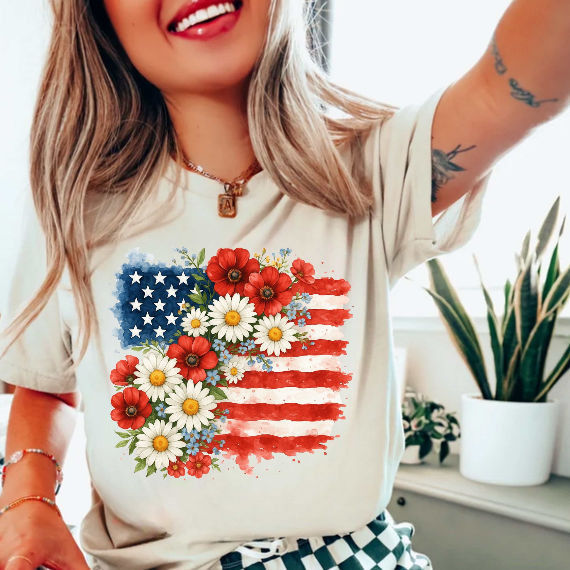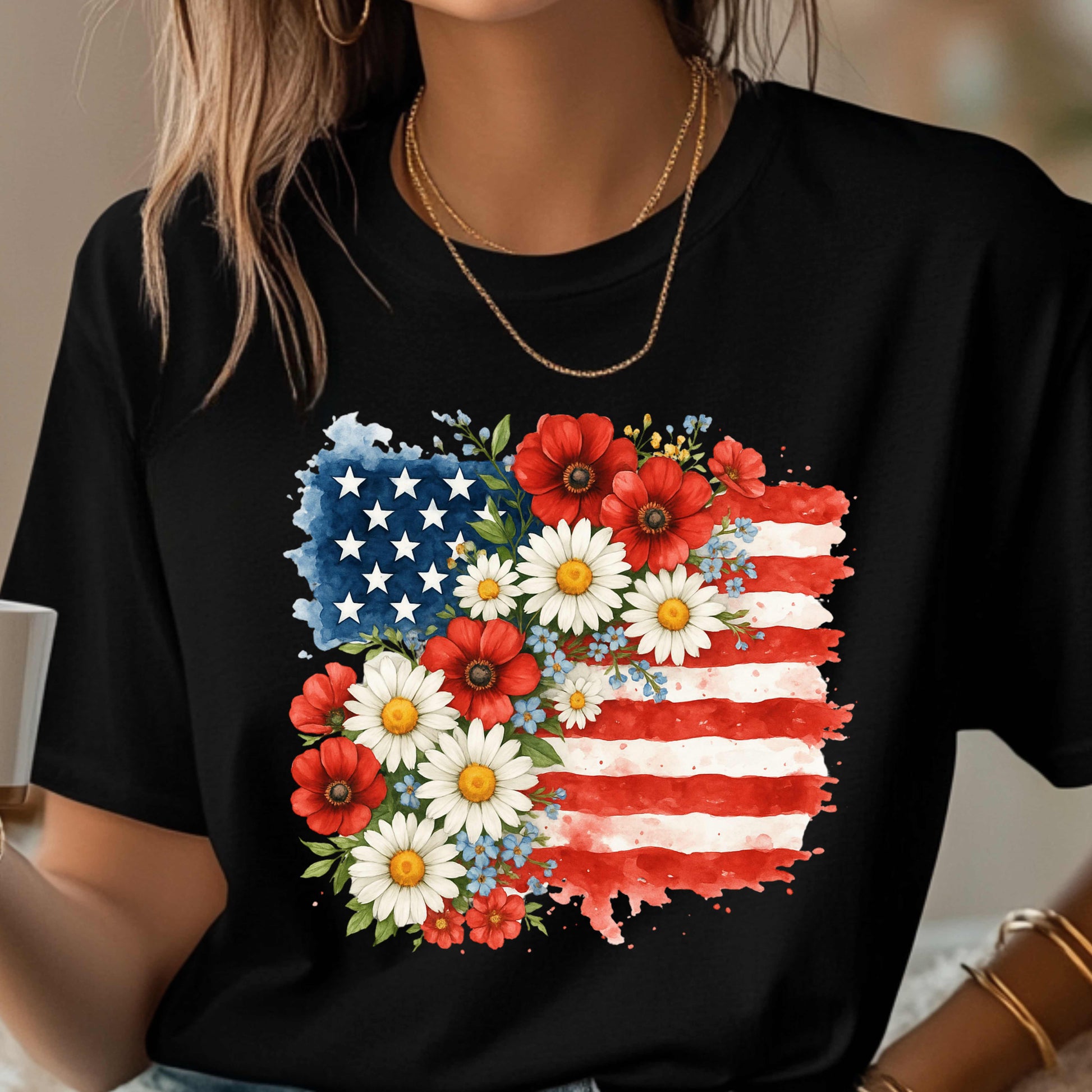 Celebrate patriotism with style in our Floral Flag 4th of July T-Shirt. This eye-catching design combines classic American pride with a fresh floral twist, perfect for summer barbecues, parades, or firework displays. Made for comfort and durability, this shirt lets you show your national spirit while standing out from the typical stars and stripes crowd. A must-have addition to your holiday wardrobe!