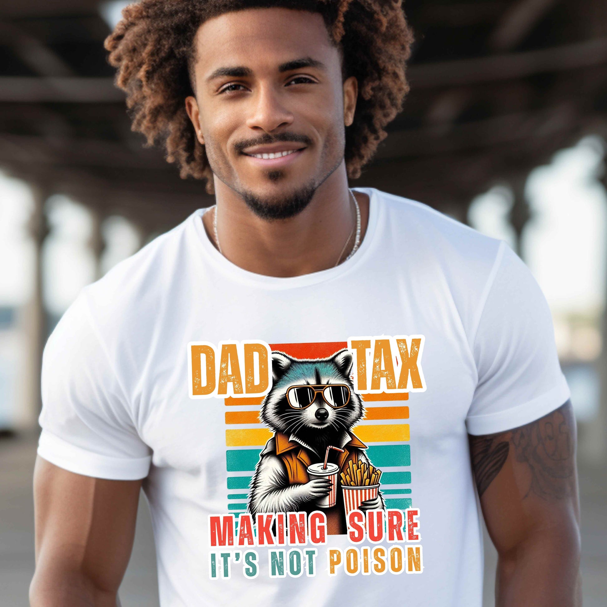 Show your dad some love with our Funny Dad T-Shirt! Let him proudly wear his "Dad Tax" shirt, making sure all food is safe for his family. A hilarious and practical Father's Day gift idea that he'll be sure to love. Get yours today!