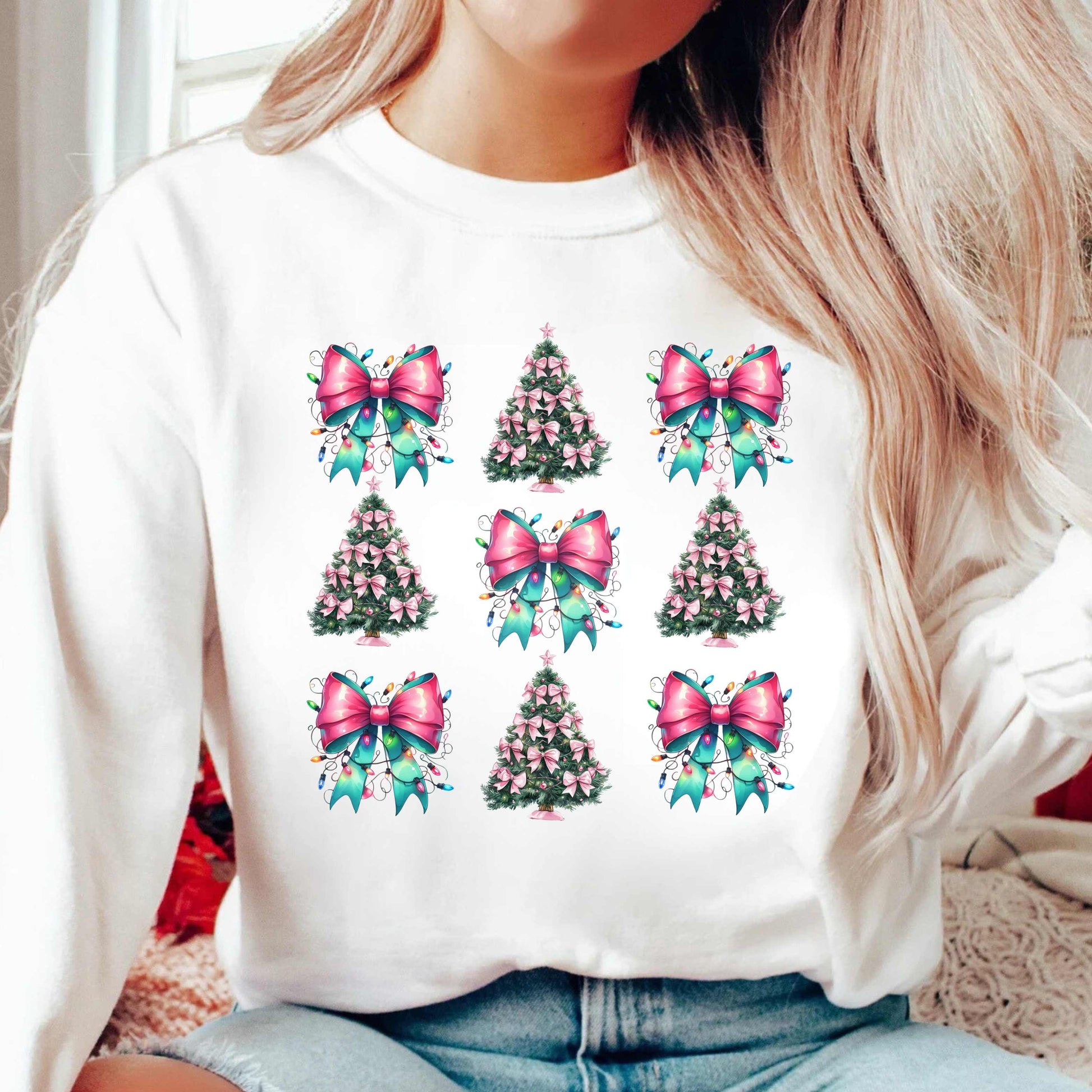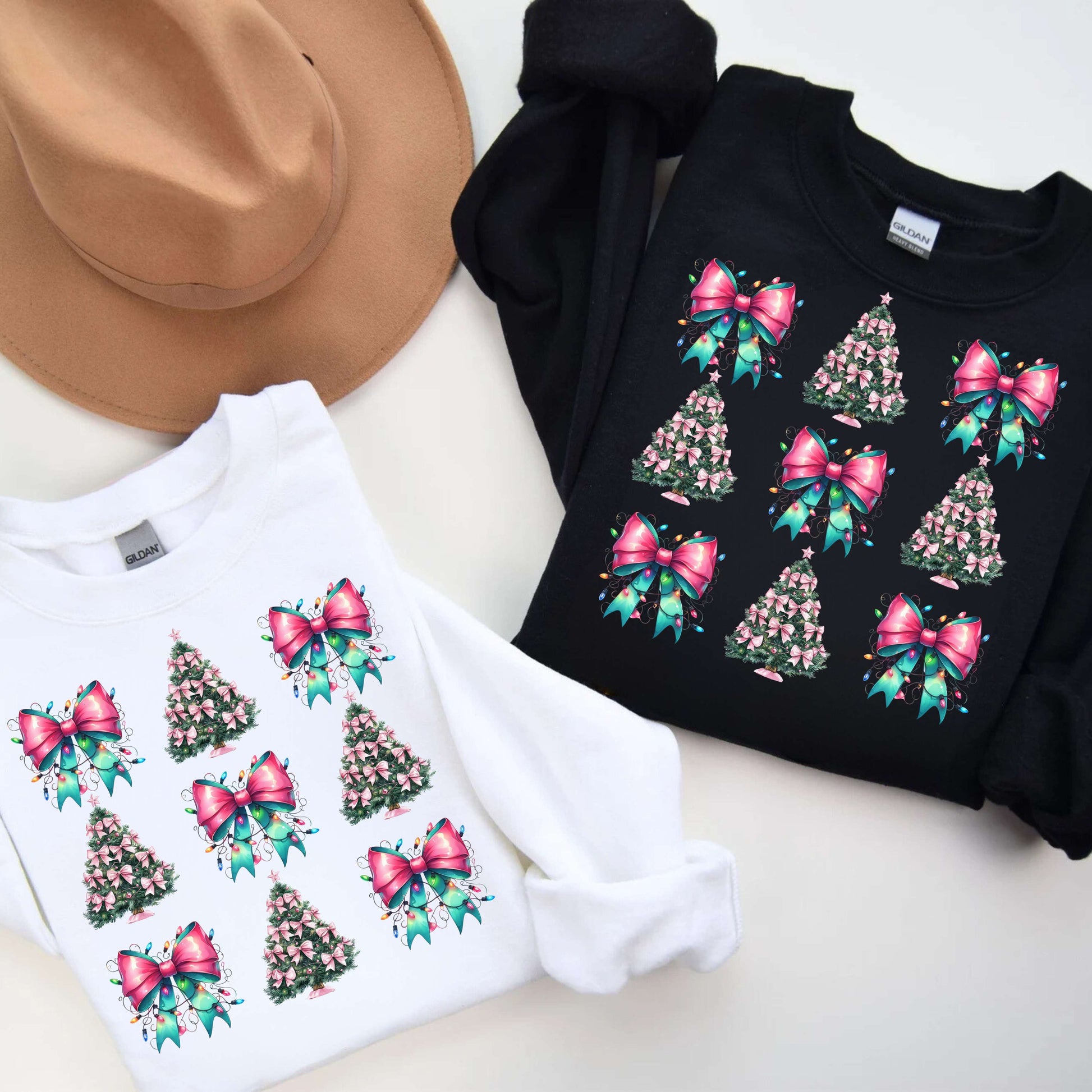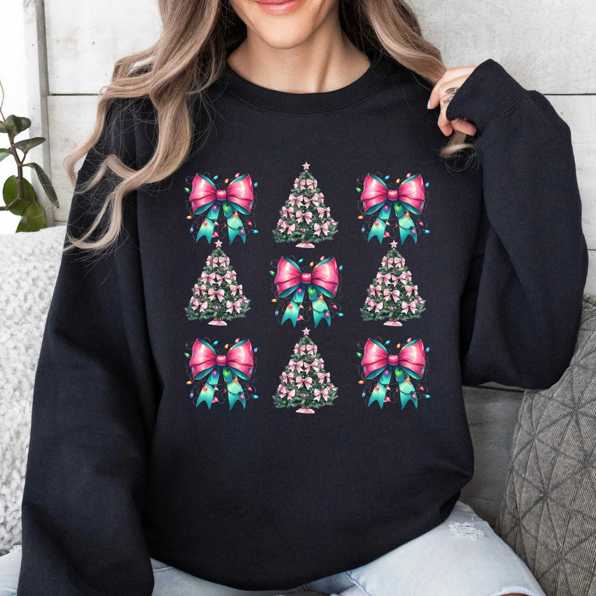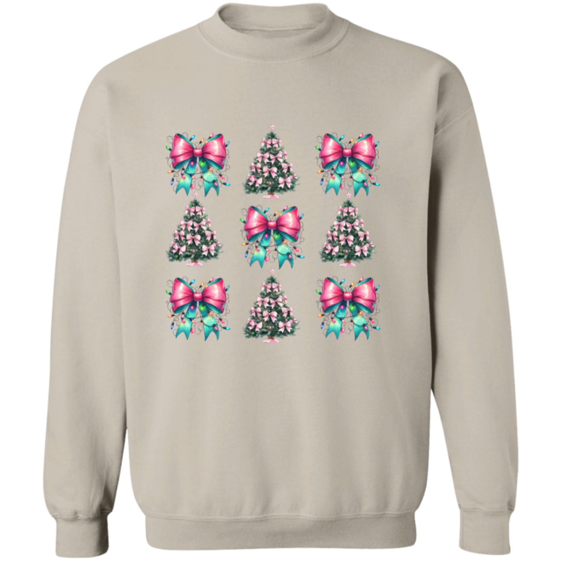 Pink and Teal Coquette Bow Christmas Tree Crewneck Pullover Sweatshirt