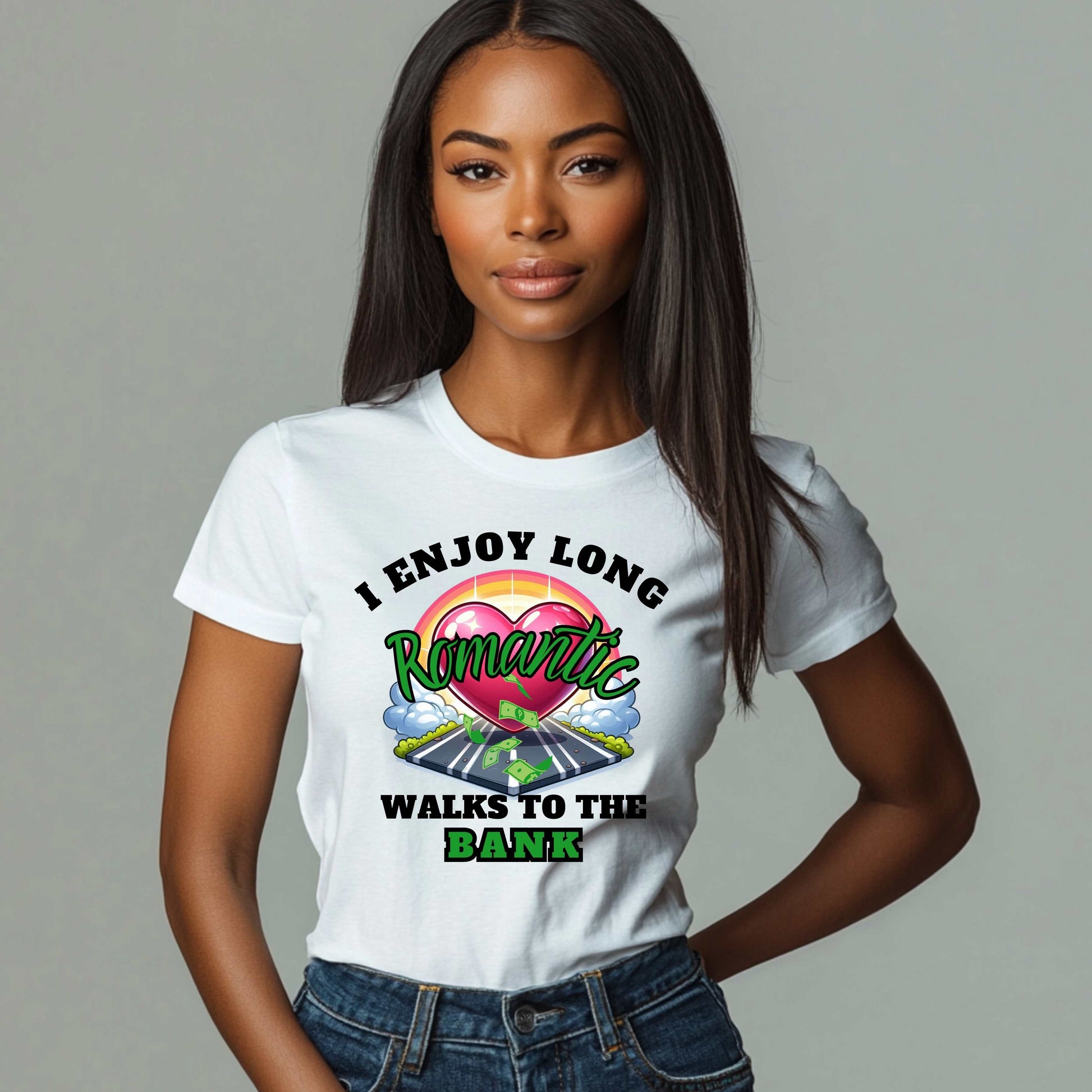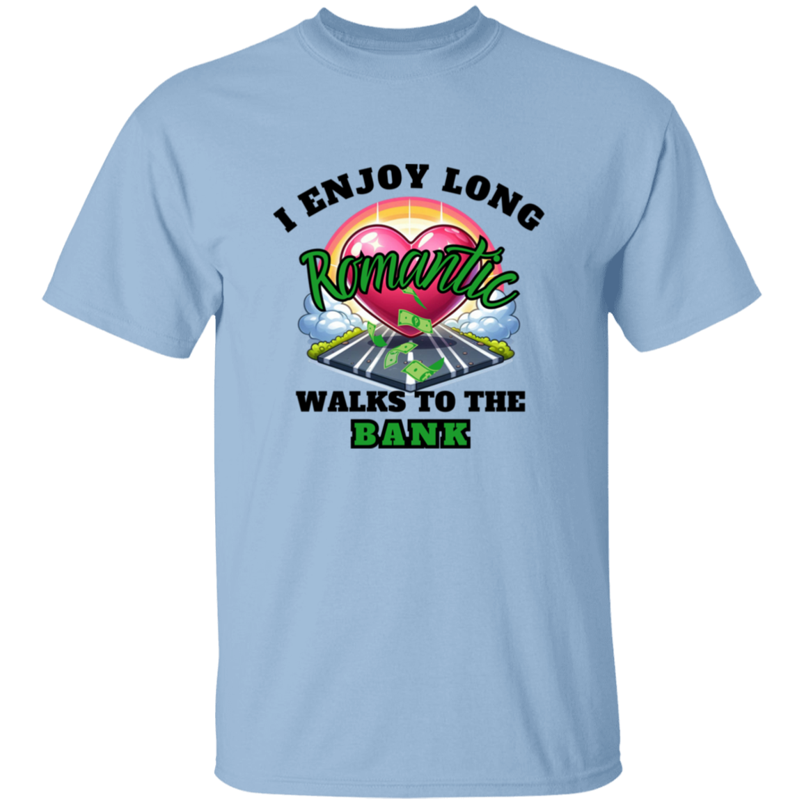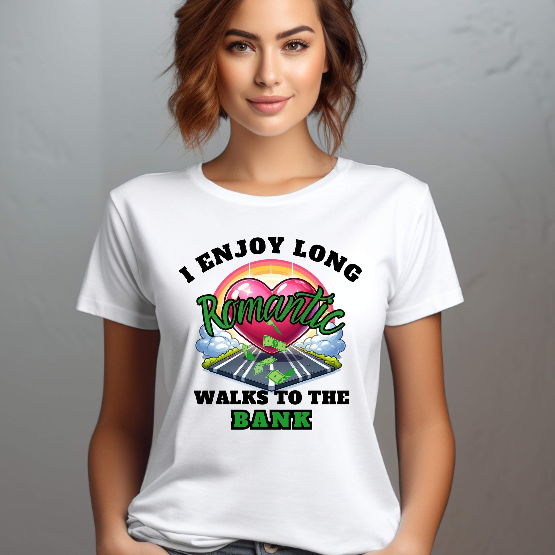 Stroll in style with our Romantic Walks To The Bank T-Shirt! Perfect for any money-savvy individual, this tee is sure to make a statement while keeping you comfortable. Embrace your quirky side and show off your love for both romance and finances with this playful and unique shirt. (No need to choose between love and money when you can have both!)