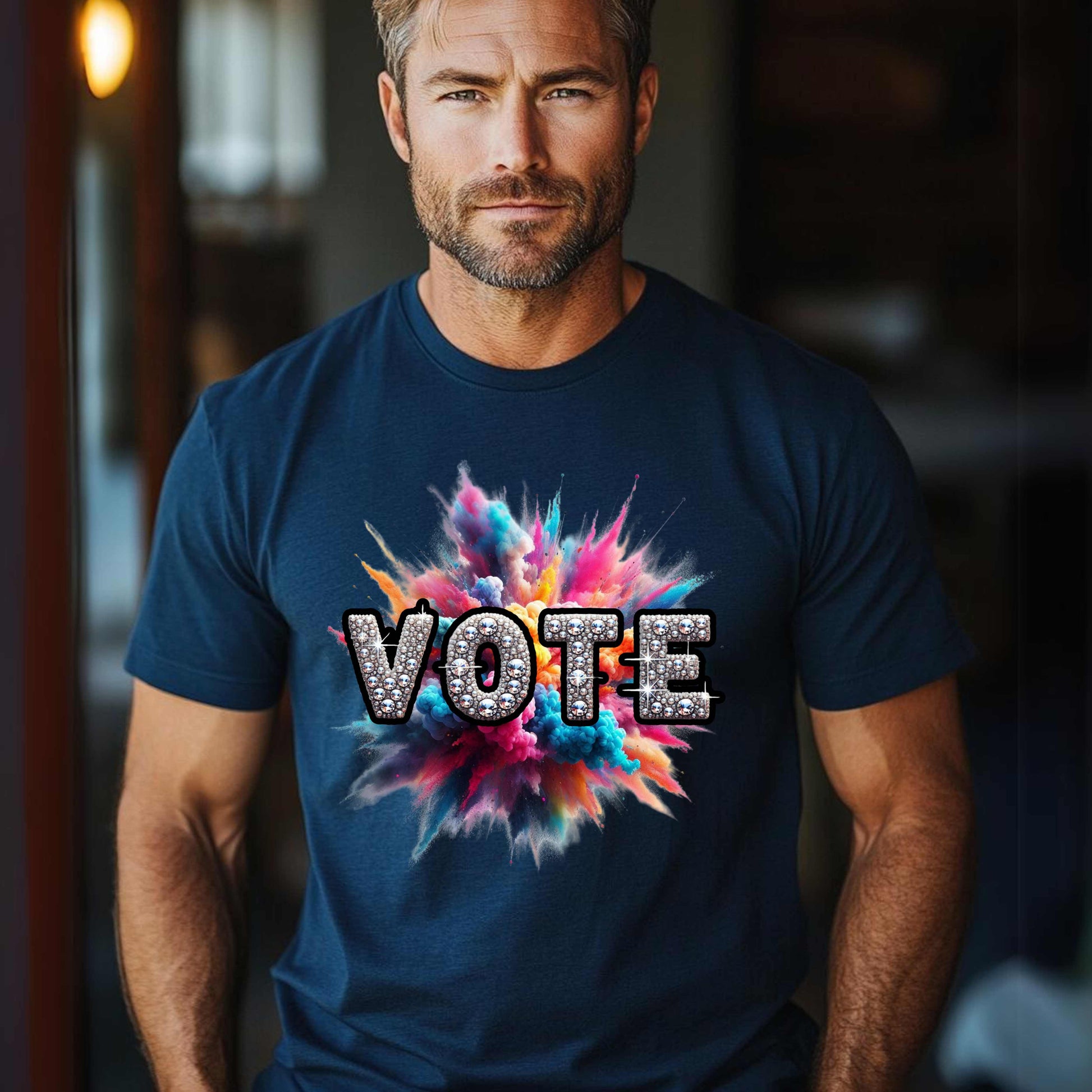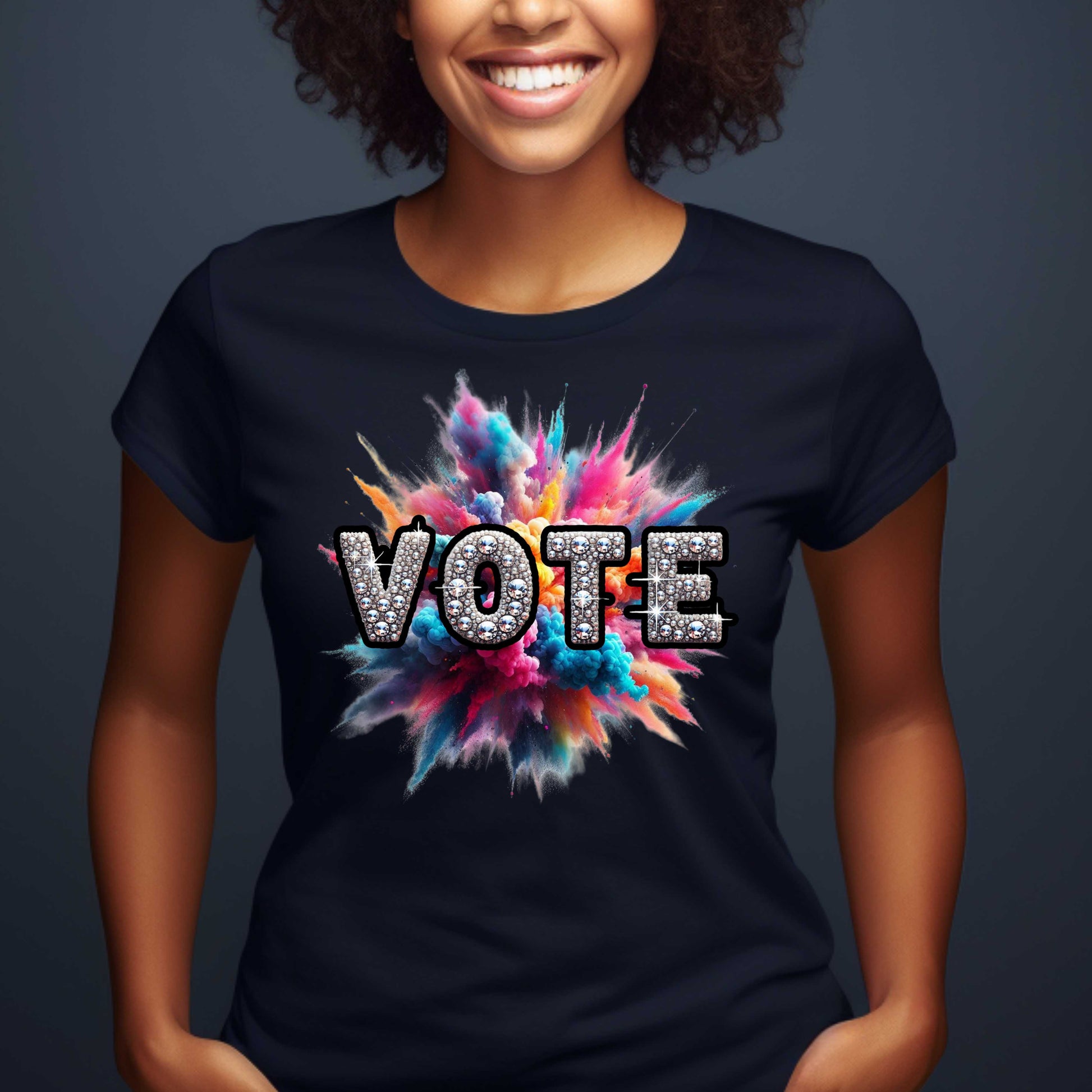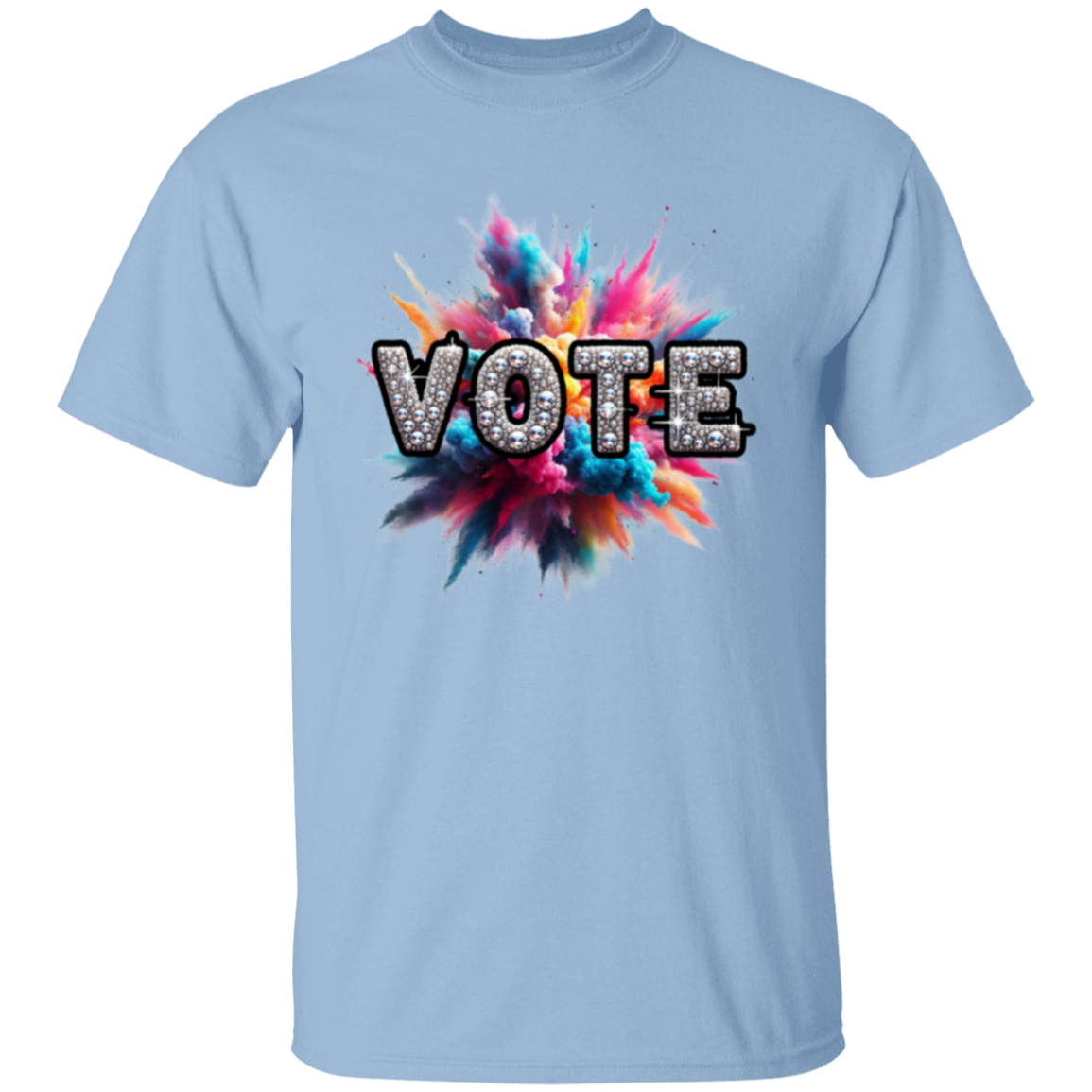 Get ready to shine with our VOTE Bling Color Blast T-Shirt! This vibrant and eye-catching shirt is the perfect way to show your support for democracy and inspire others to vote. With a stunning design and comfortable fit, you'll be sure to stand out and make a statement. Join the movement and make your voice heard with our VOTE Bling Color Blast T-Shirt!